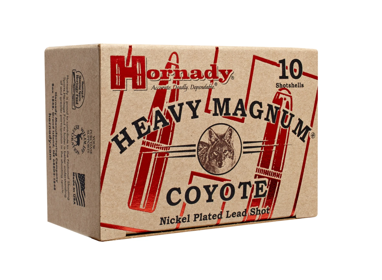 Hornady® Heavy Magnum® Coyote loads deliver lethal results and minimal pelt damage out to 50 yards. Loaded to 1,300 fps with 1½ ounces of nickel plated lead shot in your choice of BB or 00 buckshot, these 3 inch, 12 gauge shotshells are the perfect answer for close range predators. Both loads feature the Hornady® Versatite® wad that strips cleanly from the shot string for excellent pattern density and a short shot column for maximum effect on target. Not only are these loads extremely effective, they’re also an economical choice when compared to expensive tungsten options.
